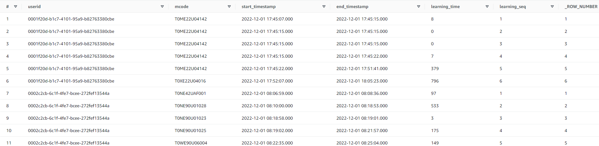 사용자 ID, mcode, start_timestamp, end_timestamp, learning_time, learning_seq 선택